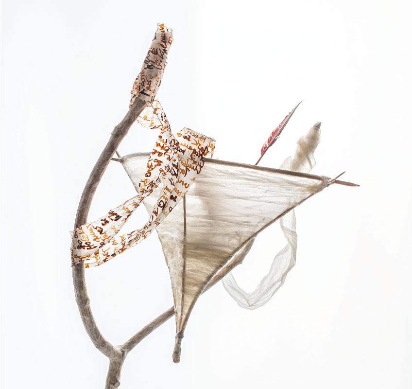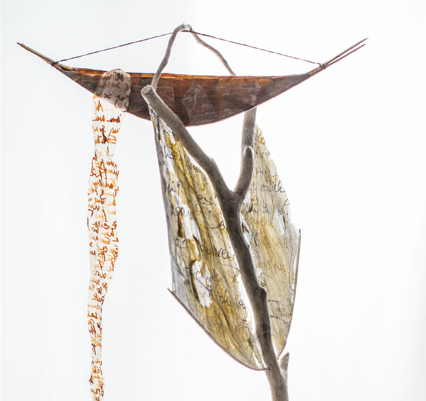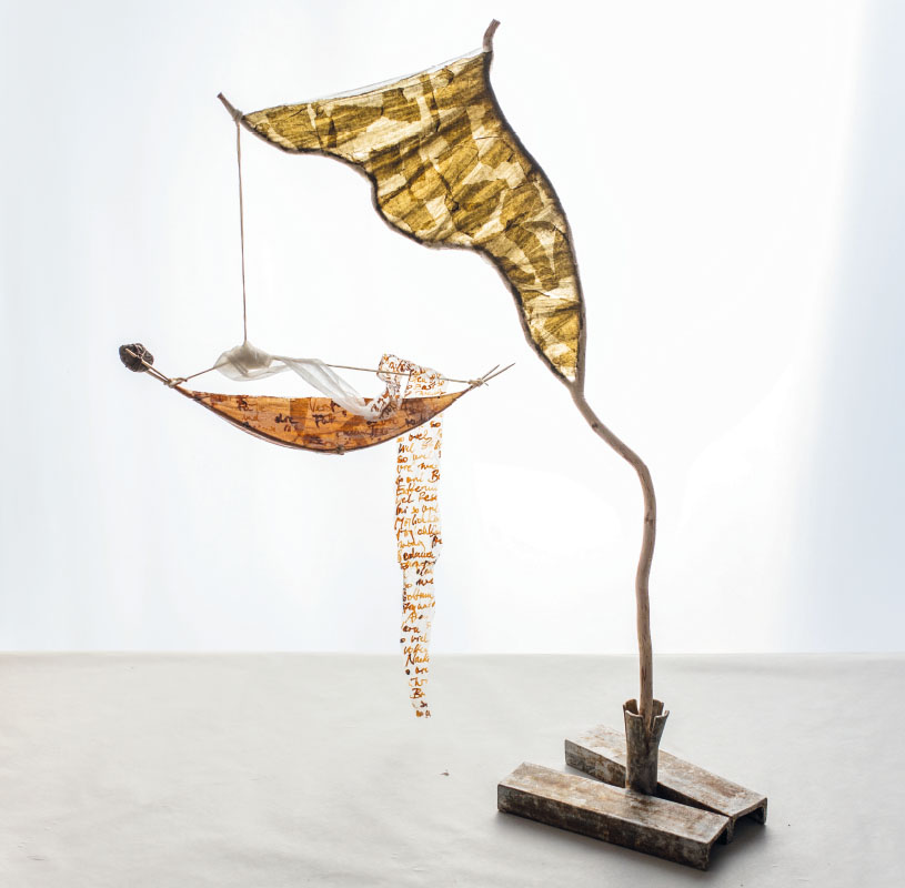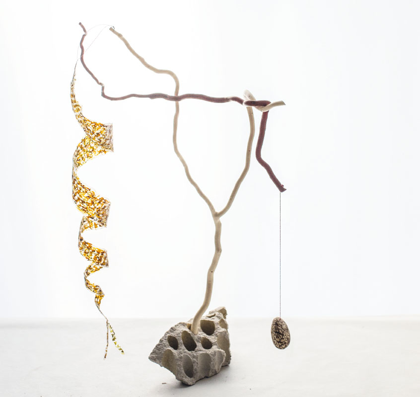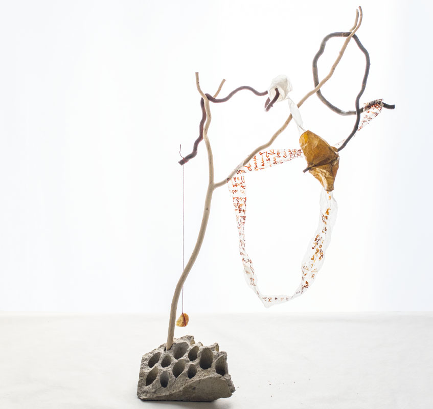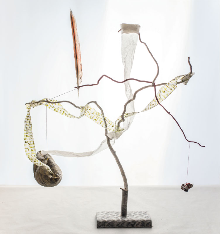 Äste, Papier, z.T. bemalt, Schnur, Stein, Höhe 81 cm