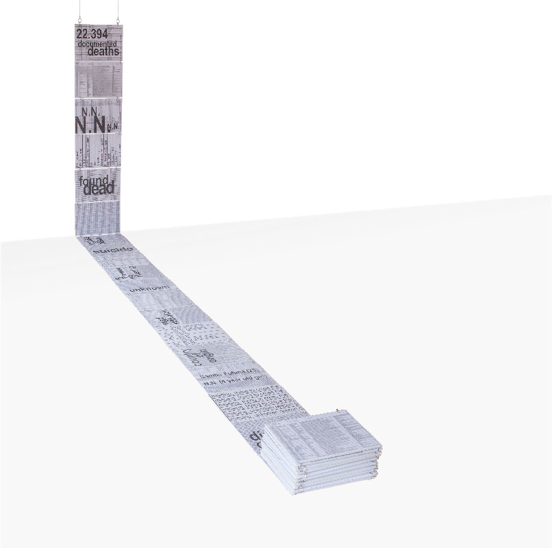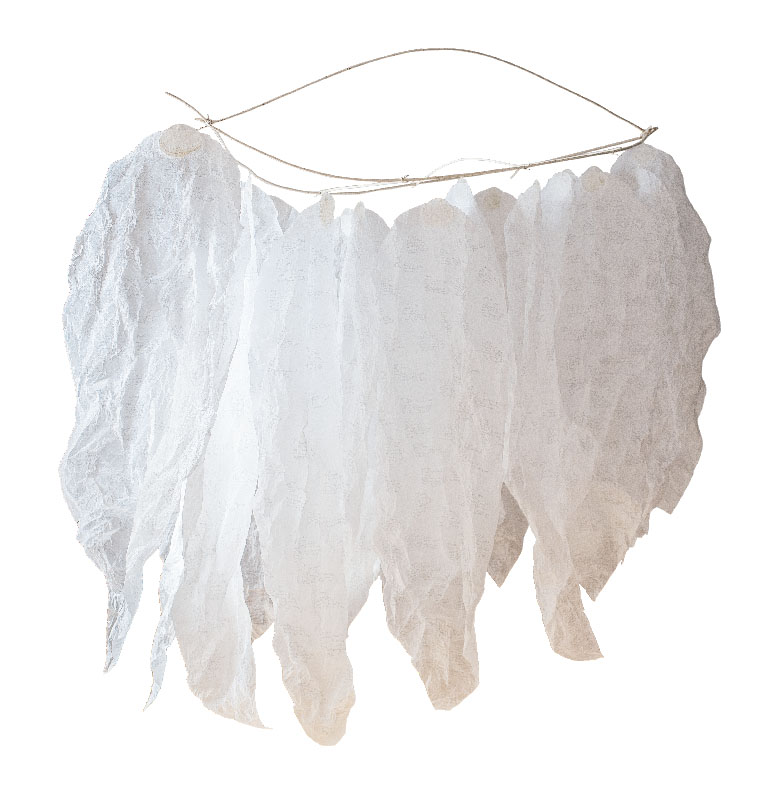 17 Papierblätter beschrieben, Äste, Schnur, 200x210x68 cm